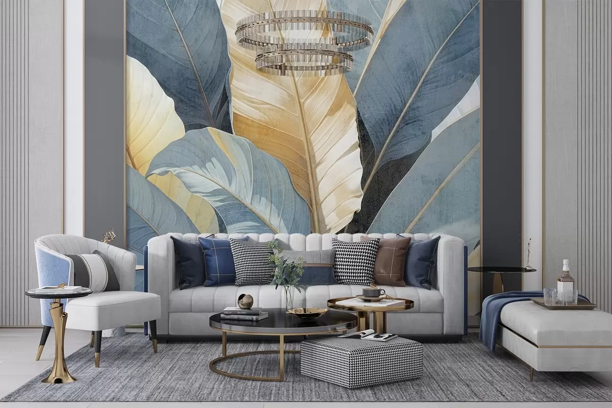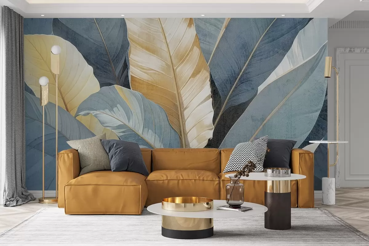 Тапете за зид Поглед изблиза на велико бујно, текстурирано декоративно тропско лишће у нијансама плаве, зелене и жуте бр. w08373