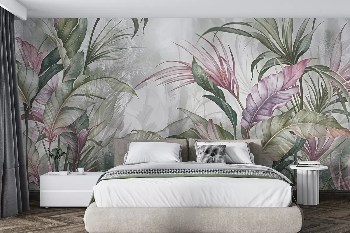 Тапете за зид Тропска џунгла са великим зеленим листовима и ружичастим цветовима протеје са замагљеном текстурираном позадином бр. w08375