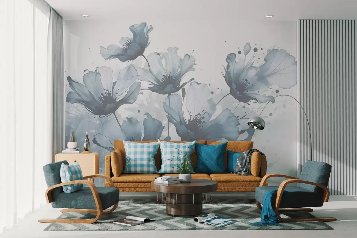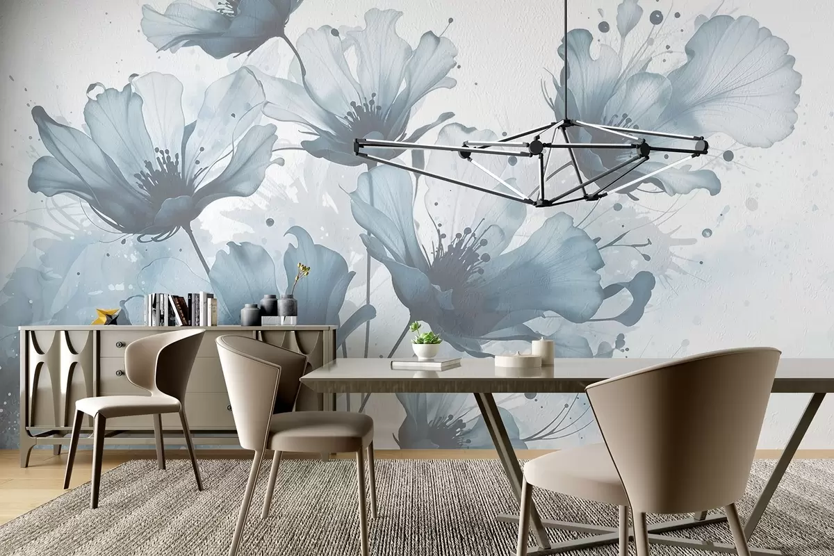 Тапете за зид Деликатно плаво цвеће са меким, замућеним латицама и прскањем акварела на светлој позадини бр. w08376