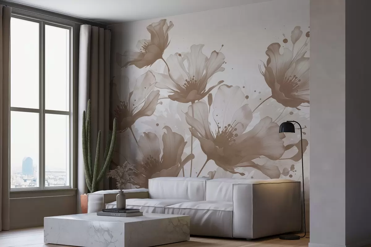 Тапете за зид Нежно смеђе цвеће са меким, замућеним латицама и прскањем акварела на светлој позадини бр. w08376v1