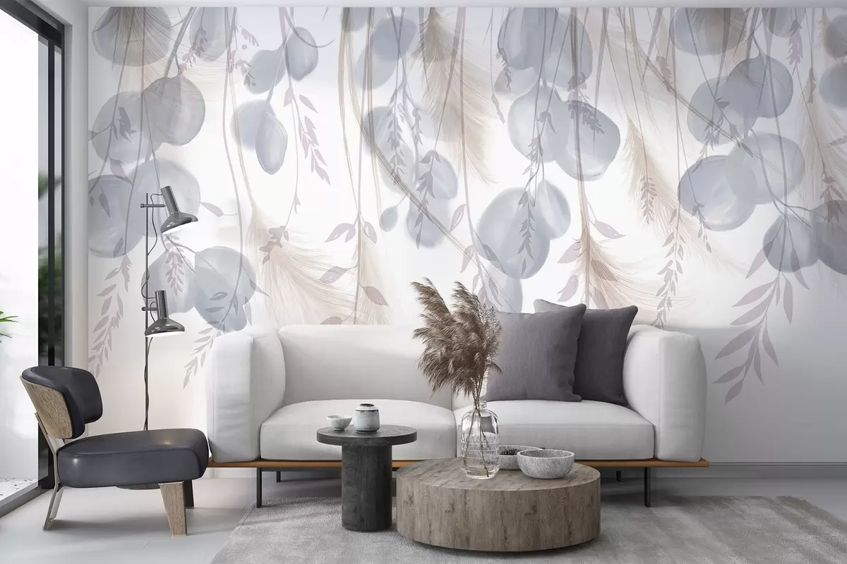 Тапете за зид Деликатно плаво и пастелно беж лишће еукалиптуса пада, стварајући спокојну и умирујућу атмосферу бр. w08380v1
