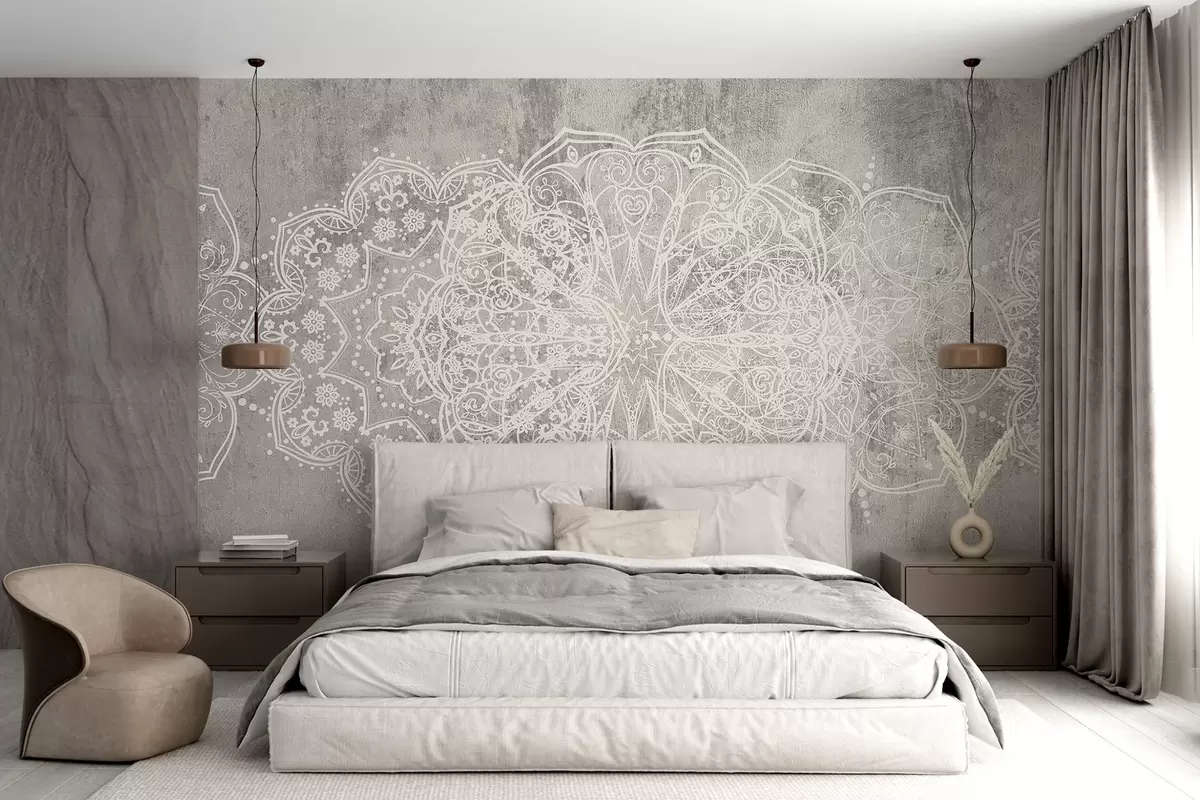 Тапете за зид Детаљан, сложен узорак мандале од беле чипке на текстурираној позадини сивог зида у поткровљу бр. w08387