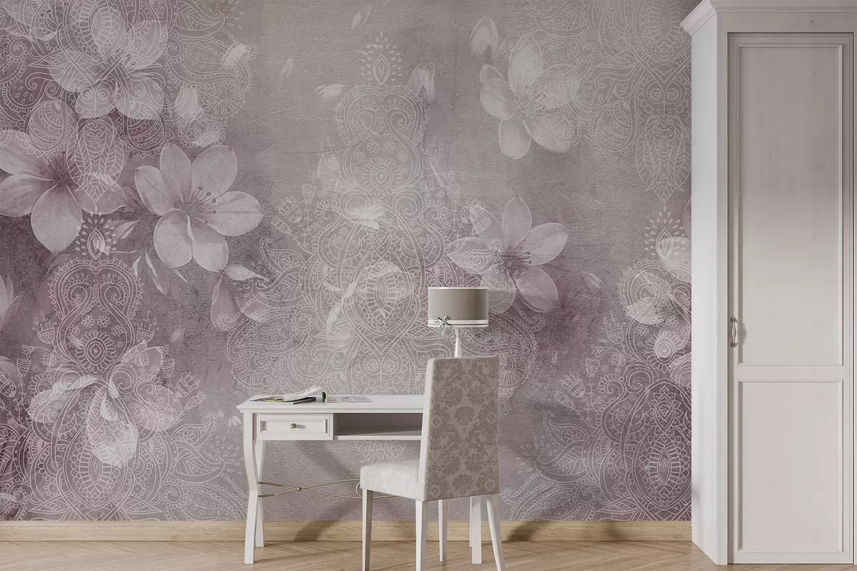 Тапете за зид Цртеж меког фокуса деликатног белог цвећа на замућеној текстурираној чипканој бордо позадини бр. w08405v2
