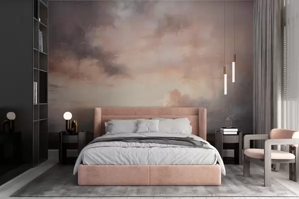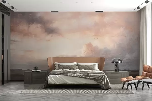 Тапете за зид Драматични пејзаж са текстуром отиска облачног неба изнад мирног језера на заласку сунца, са брдима видљивим у даљини бр. w08409