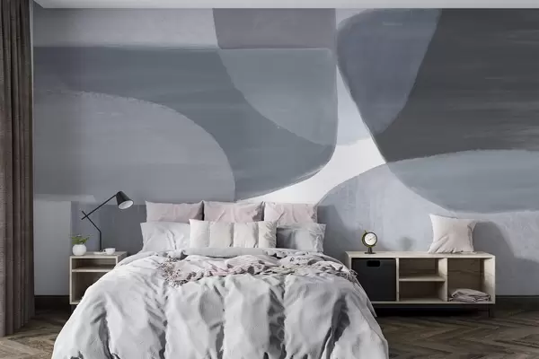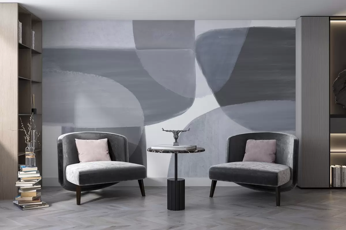 Тапете за зид Једнобојна апстрактна штампа са преклапајућим минималистичким облицима и облицима у нијансама сиве и плаве бр. w08410