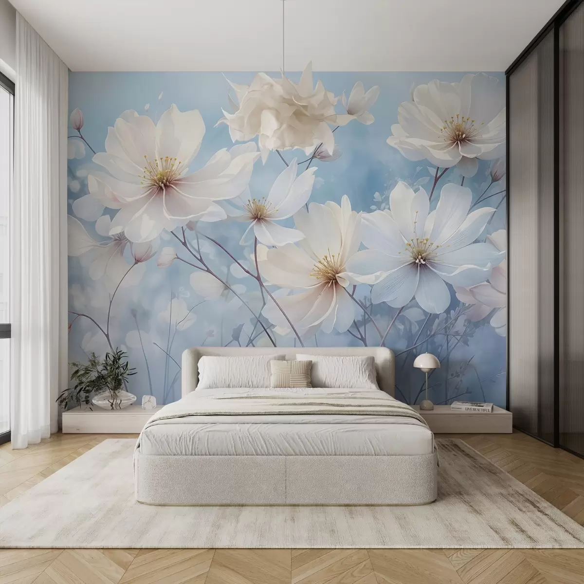 Тапете за зид Нежно бело цвеће са меким латицама на замућеној плавој позадини, стварајући спокојну и етеричну атмосферу бр. w08412