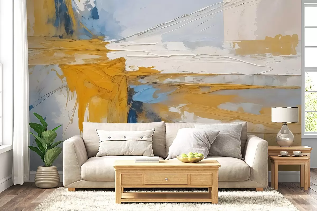 Тапете за зид Минималистичка апстрактна уметничка композиција са смелим потезима жуте, плаве и беле боје бр. w08414
