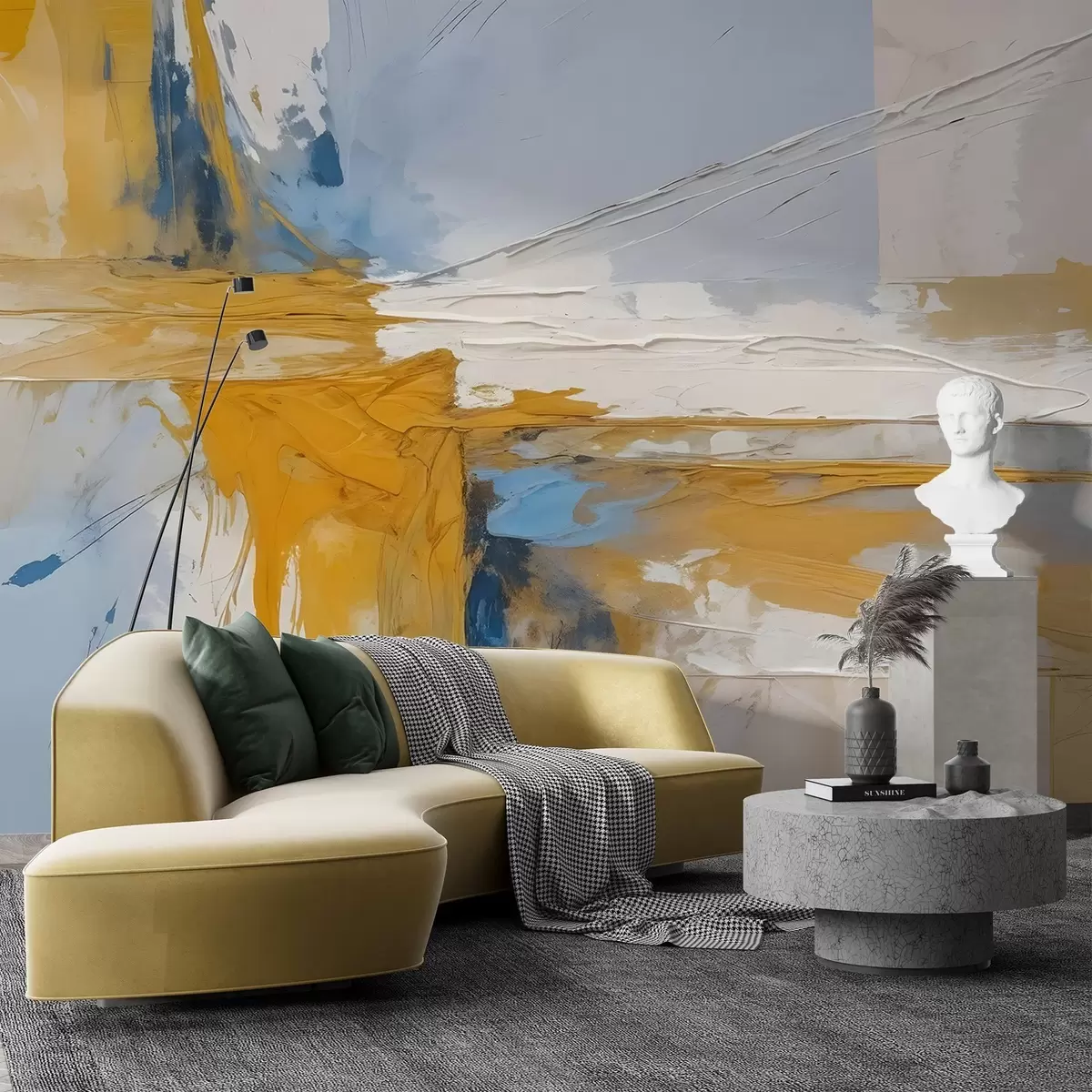 Тапете за зид Минималистичка апстрактна уметничка композиција са смелим потезима жуте, плаве и беле боје бр. w08414