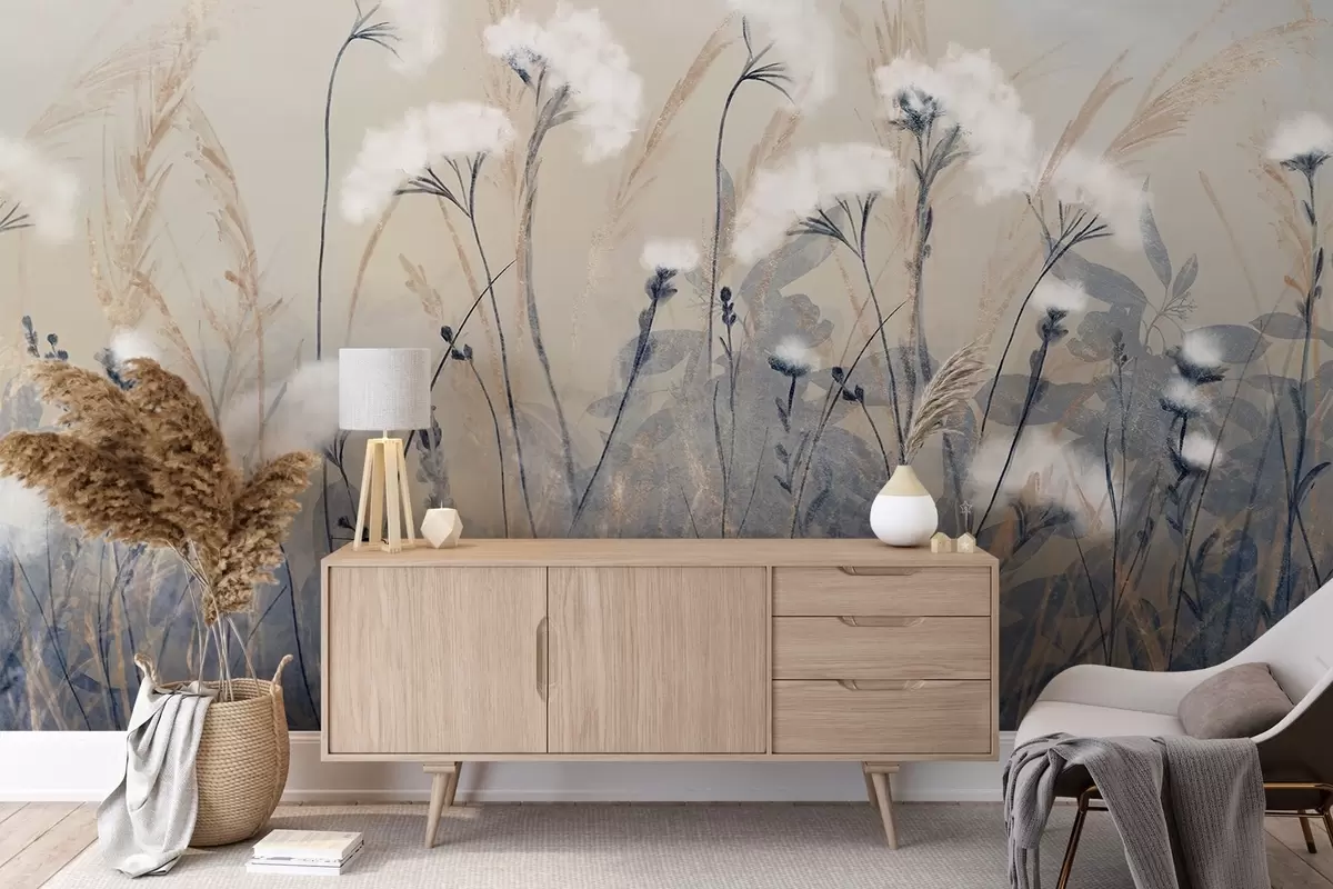 Тапете за зид Пахуљаста бела памучна трава на замућеној текстурној позадини, са меком, магловитом и спокојном атмосфером бр. w08416