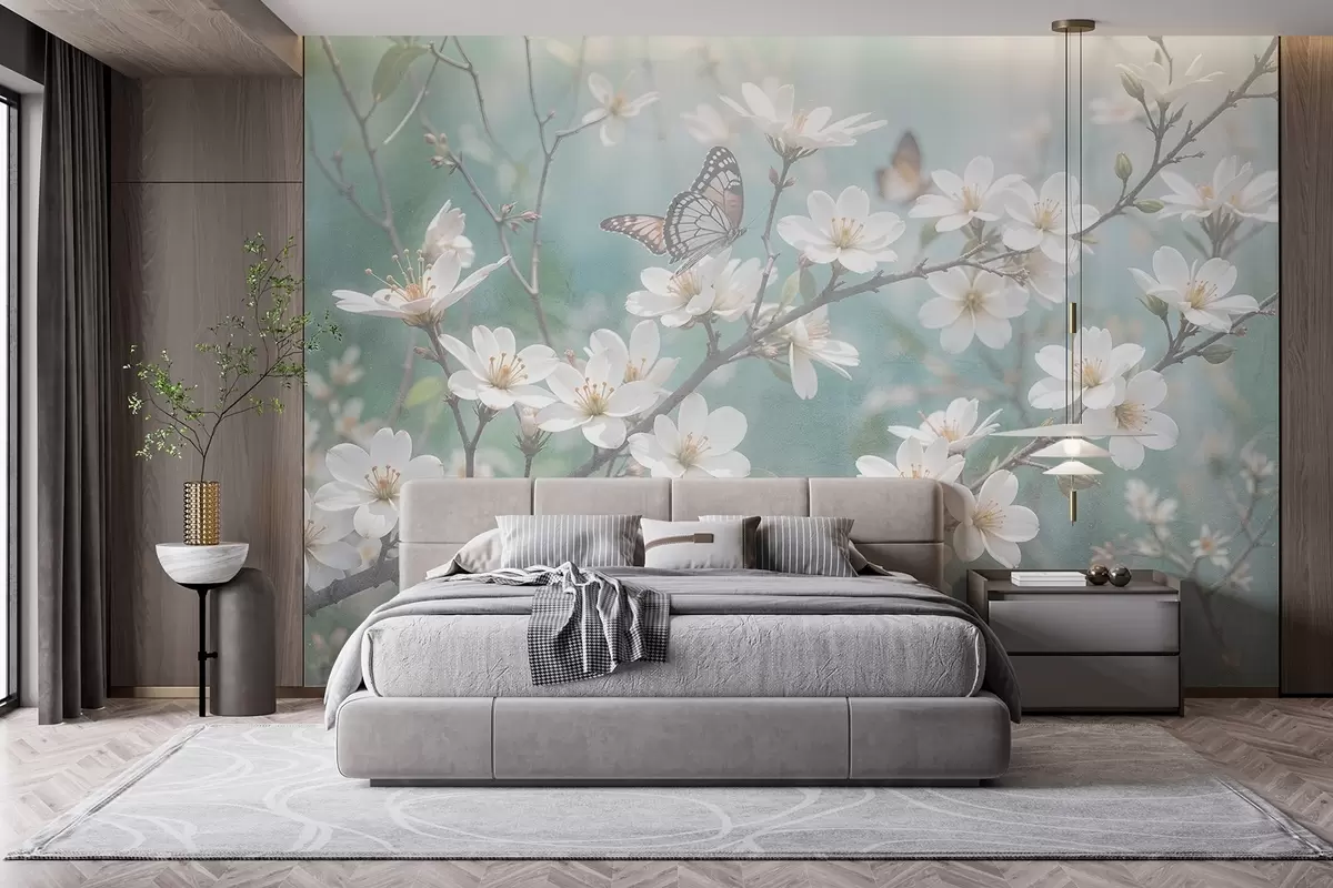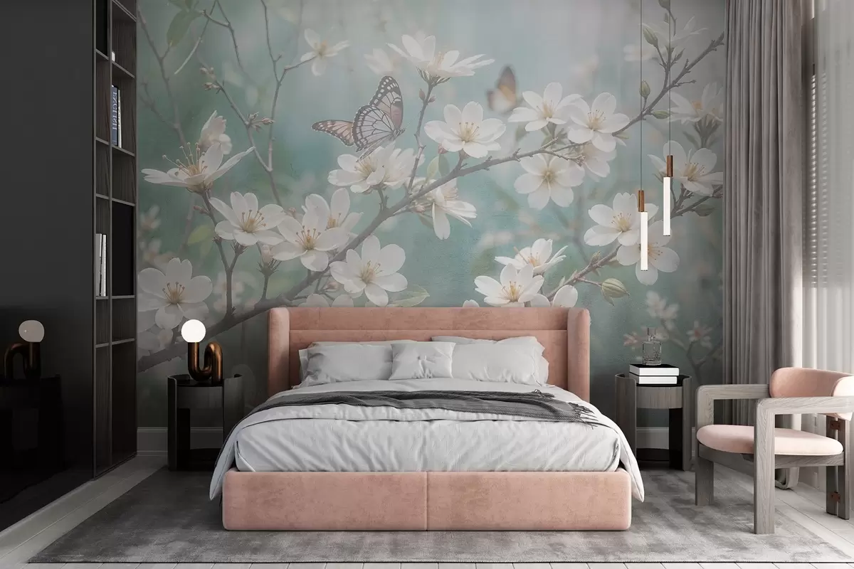 Тапете за зид Бели лептир на грани са деликатним белим цветовима трешње у првом плану на замућеној позадини бр. w08421