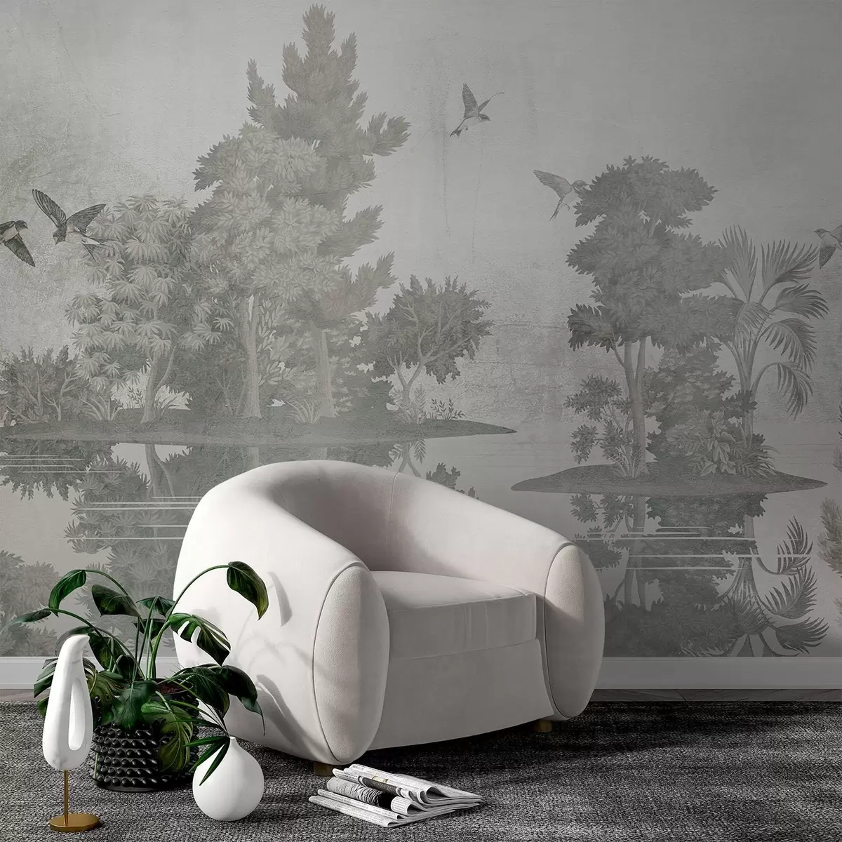 Тапете за зид Штампа шумског пејзажа са језером окруженим боровима и другим лишћем на текстурној зеленој позадини бр. w08426v1