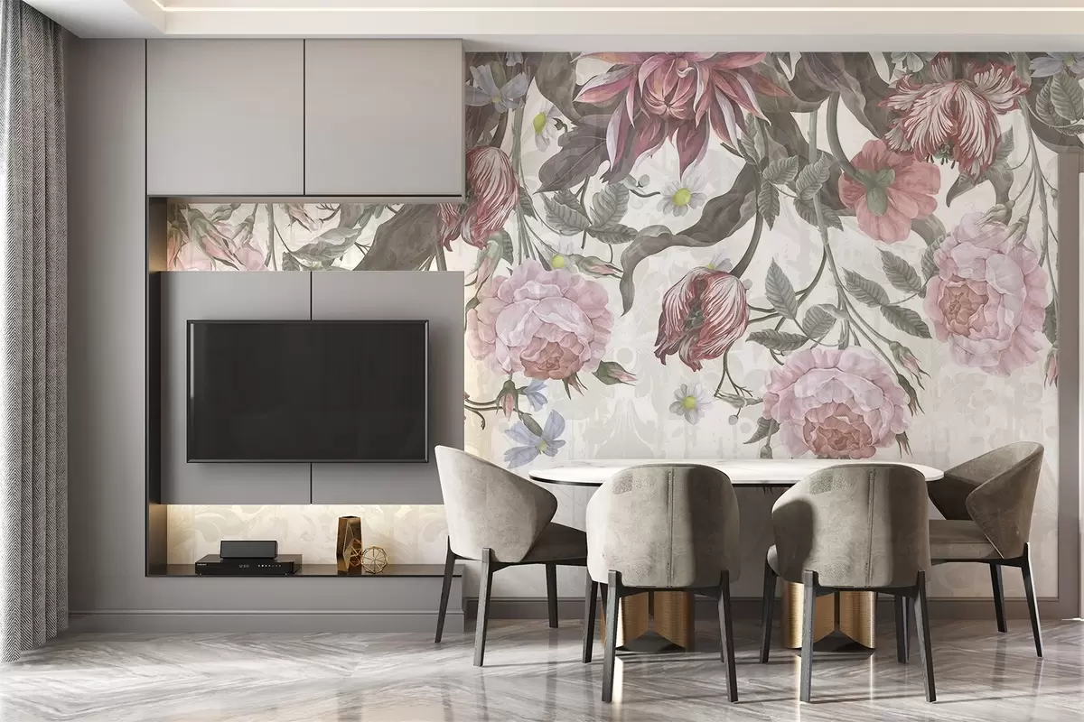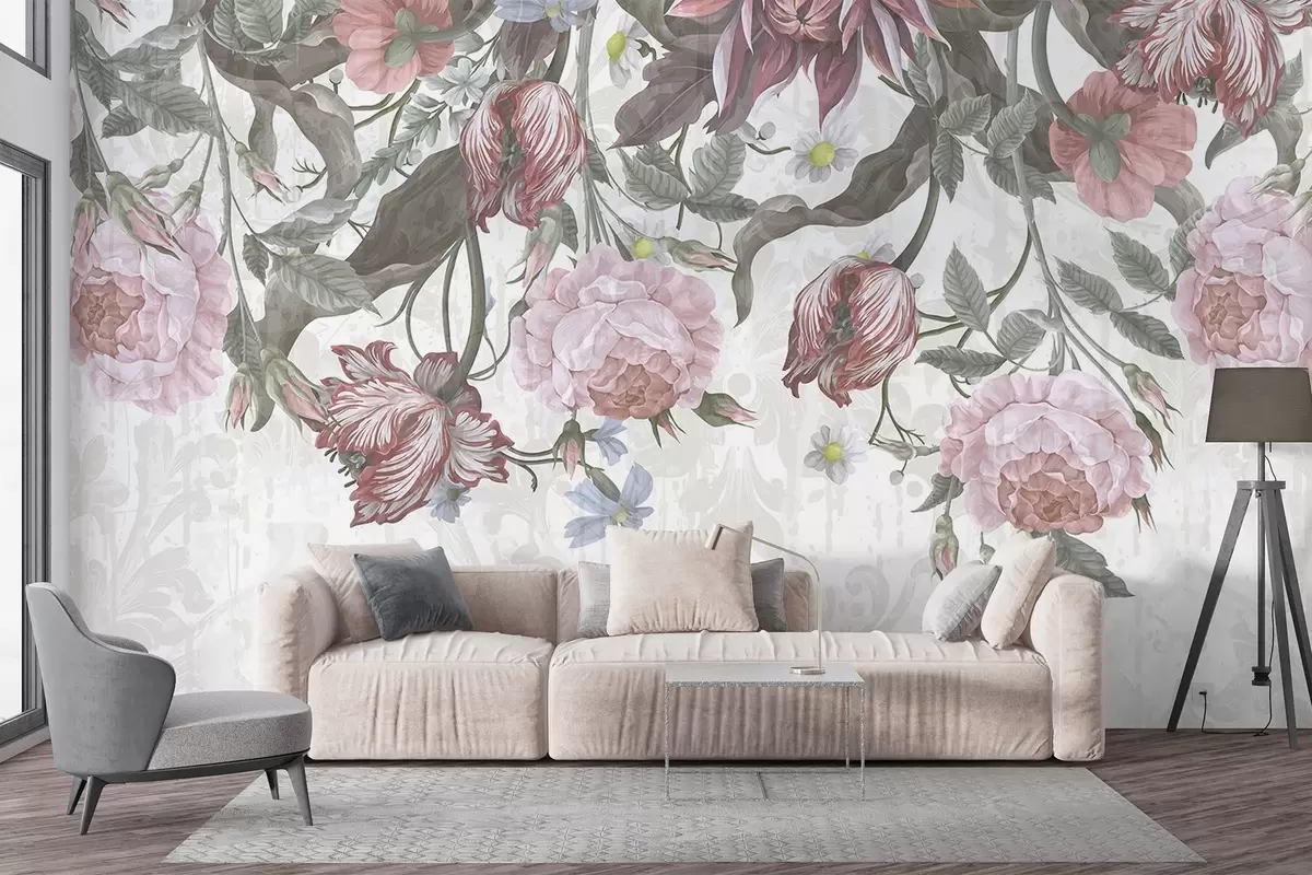 Тапете за зид Бујни цветни аранжман са великим ружичастим и белим цветовима, са зеленим листовима и стабљикама бр. w08435