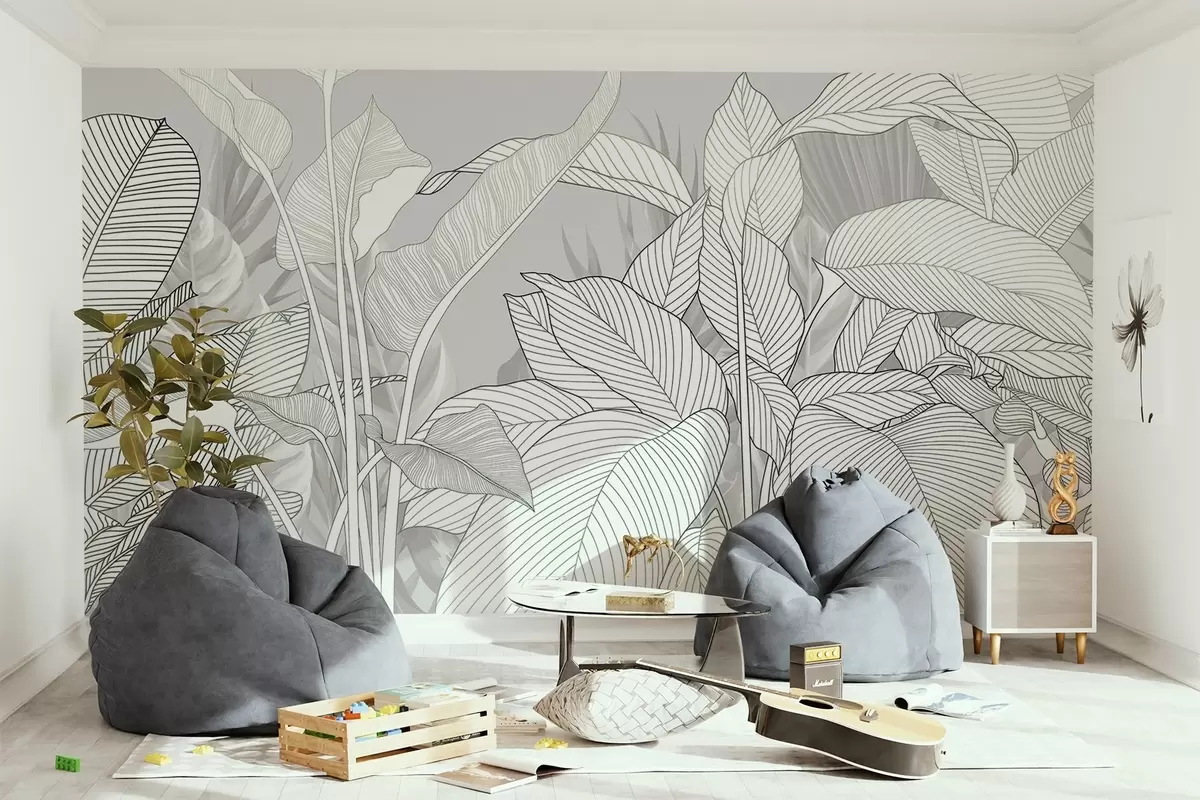 Тапете за зид Једнобојна илустрација са великим, стилизованим листовима и лишћем са замршеним шарама и текстурама бр. w08436