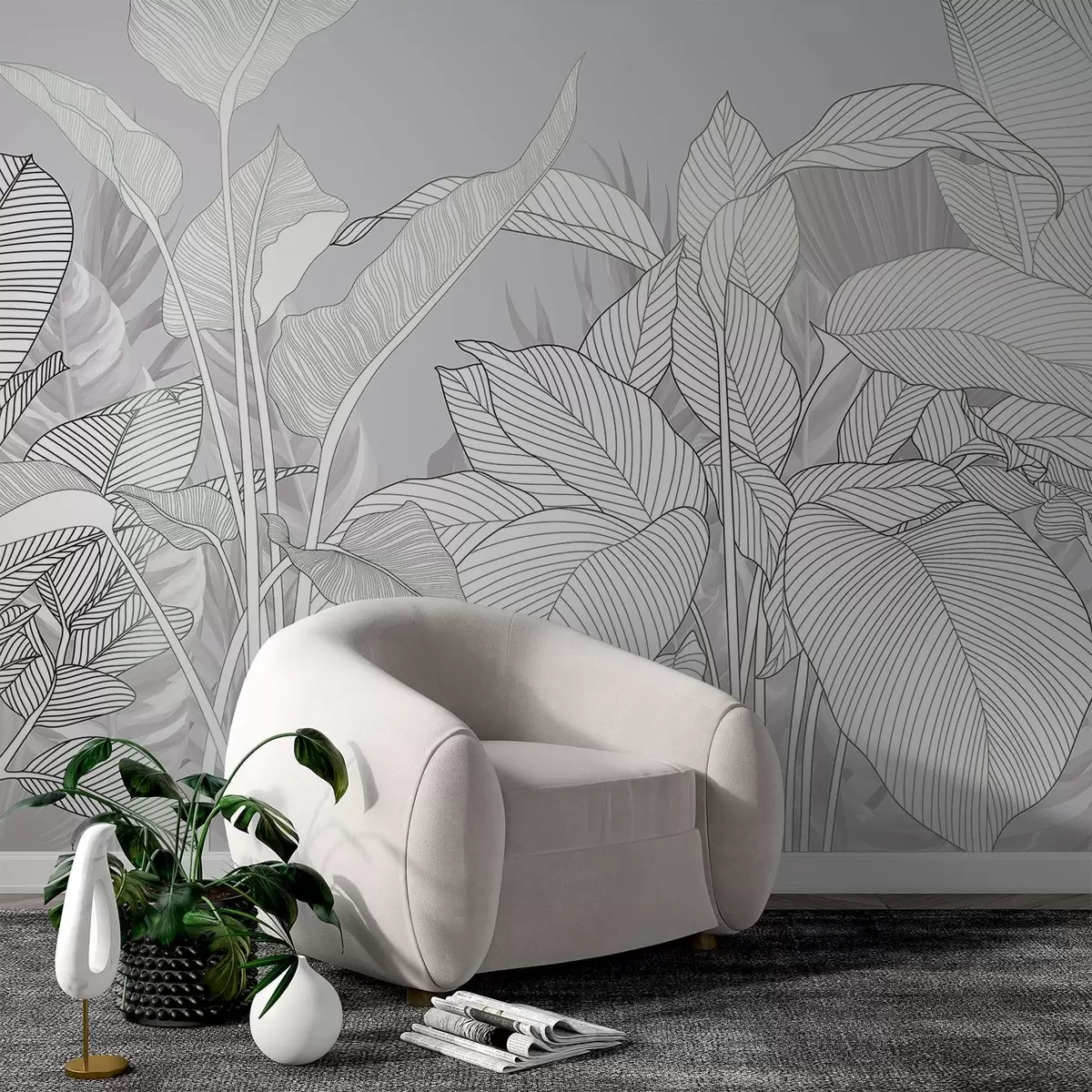 Тапете за зид Једнобојна илустрација са великим, стилизованим листовима и лишћем са замршеним шарама и текстурама бр. w08436