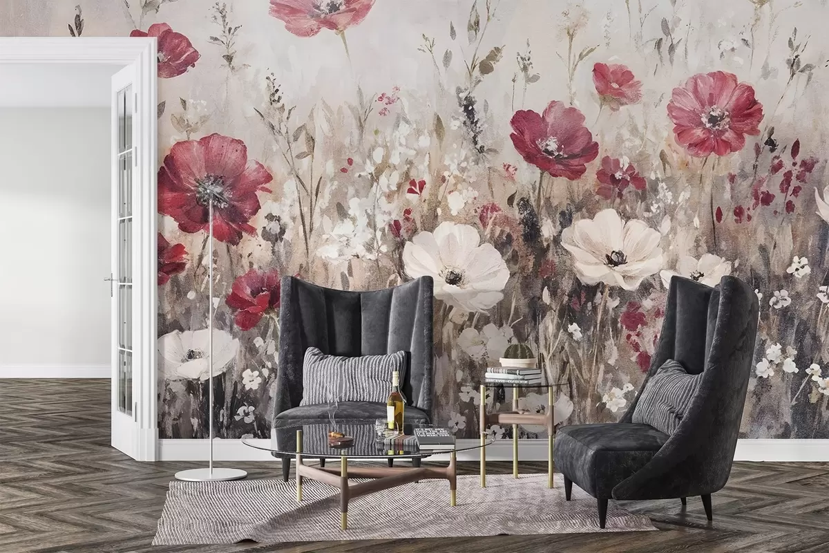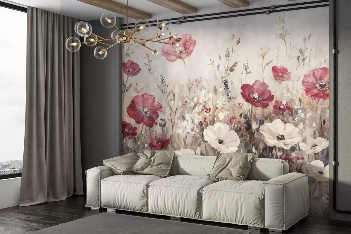 Тапете за зид Поље живописног црвеног и белог цвећа на мекој, магловитој позадини у стилу уљаног сликарства бр. w08438