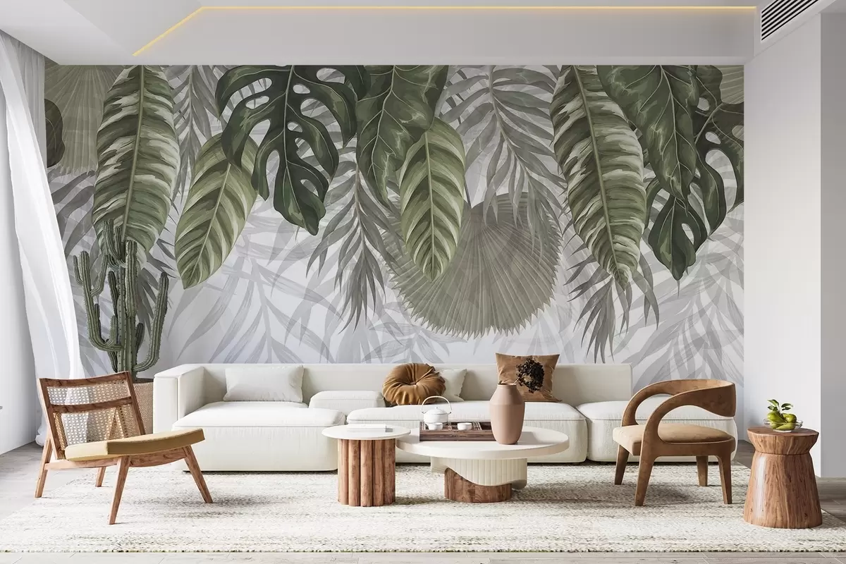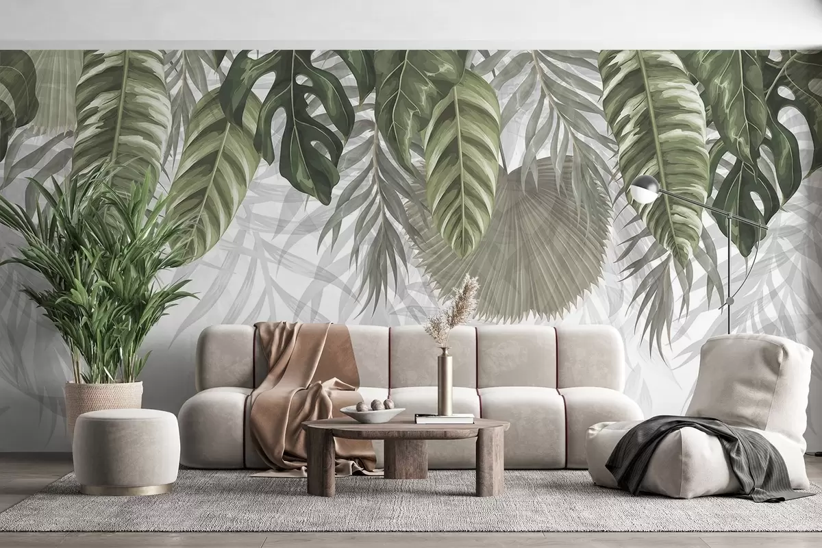 Тапете за зид Тропско лишће у нијансама зелене, укључујући велико лишће монстере и палмино лишће на белој позадини бр. w08443