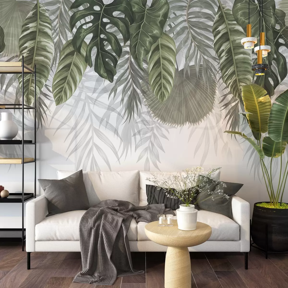 Тапете за зид Тропско лишће у нијансама зелене, укључујући велико лишће монстере и палмино лишће на белој позадини бр. w08443