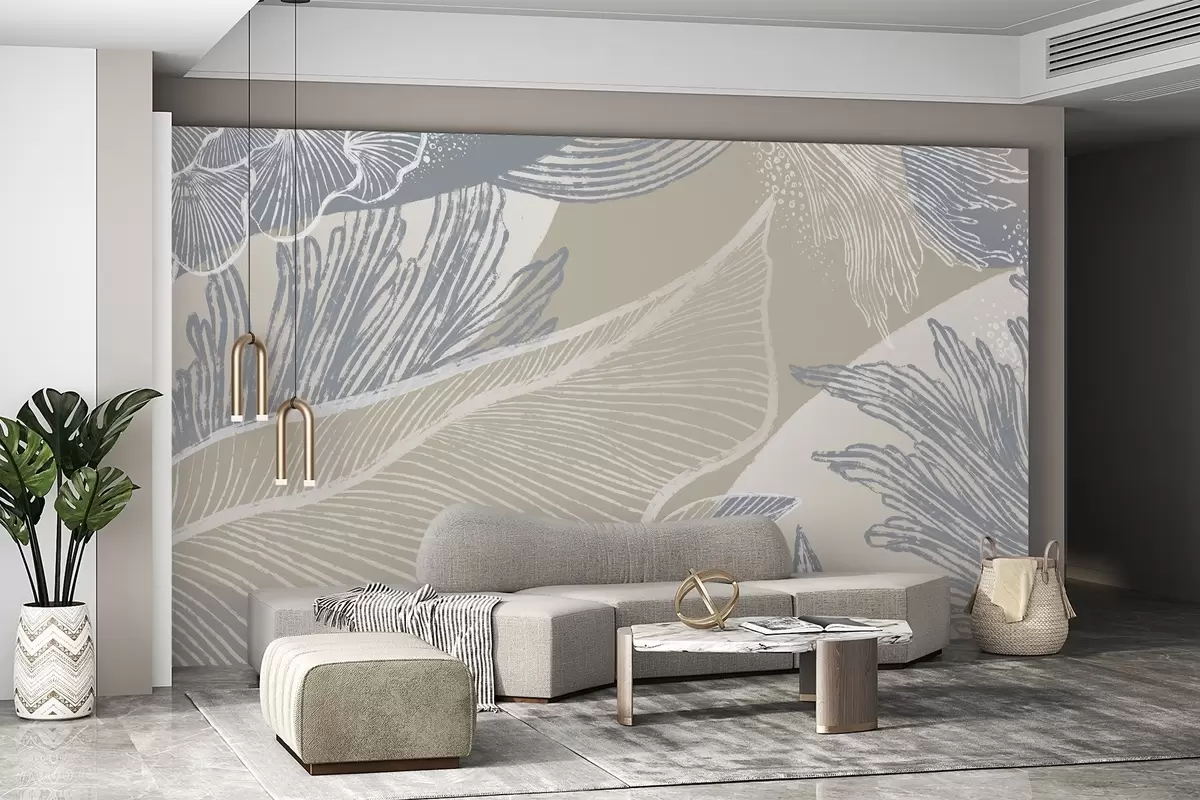 Тапете за зид Пастелно плава и бела апстрактна штампа са органским облицима и линијама са пригушеном палетом боја бр. w08450