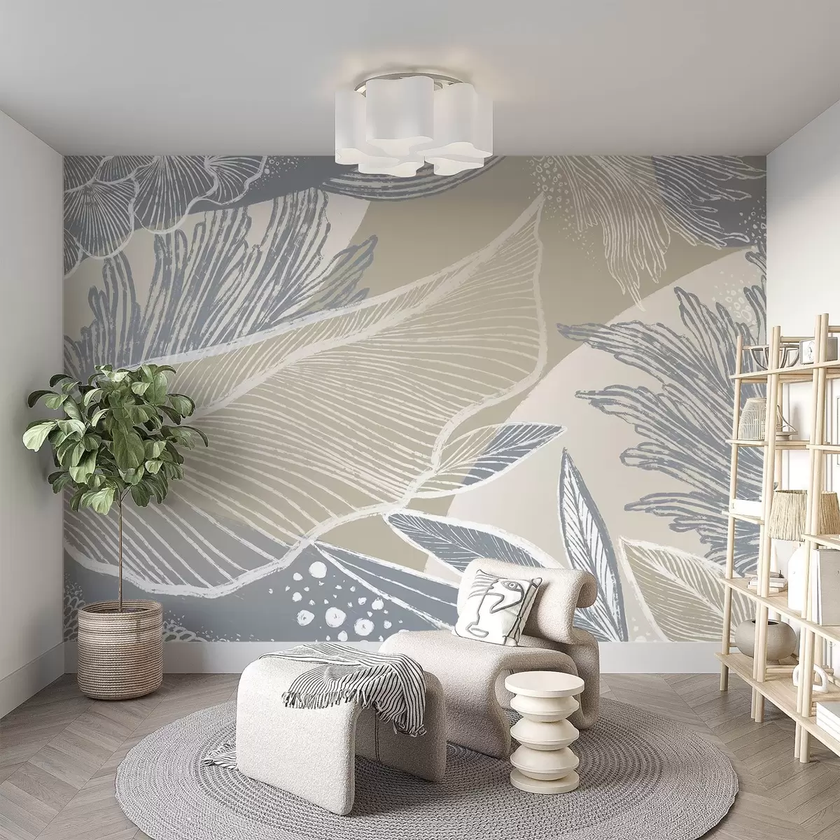 Тапете за зид Пастелно плава и бела апстрактна штампа са органским облицима и линијама са пригушеном палетом боја бр. w08450