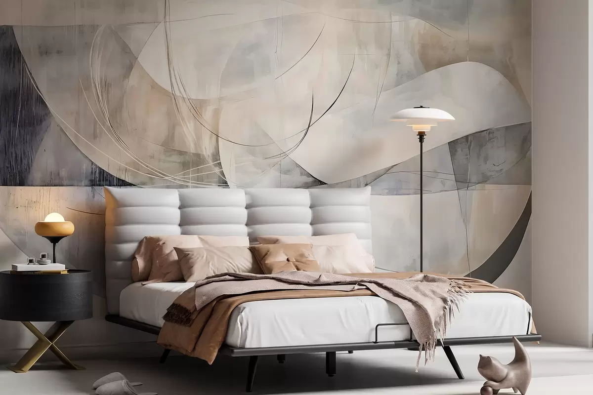 Тапете за зид Апстрактни облици и форме у нијансама беле, сиве, беж и плаве на замућеној текстурираној позадини бр. w08461