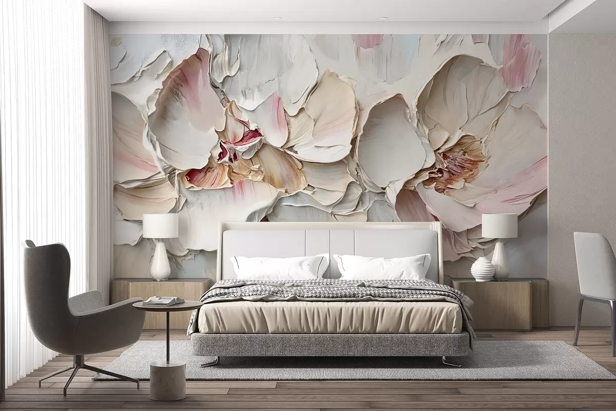 Тапете за зид Нежно, бледо ружичасто цвеће са меким, слојевитим латицама на пригушеној, текстурираној позадини имитација импасто уљане слике бр. w08467