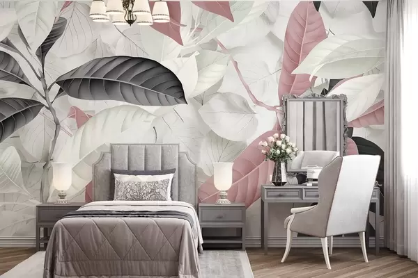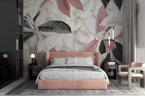 Тапете за зид Велики отисак ружичастог и сивог лишћа на светлој текстурираној позадини, стварајући бујни тропски осећај бр. w08468