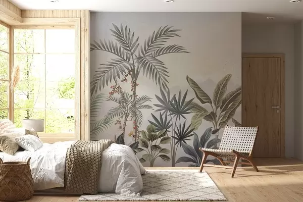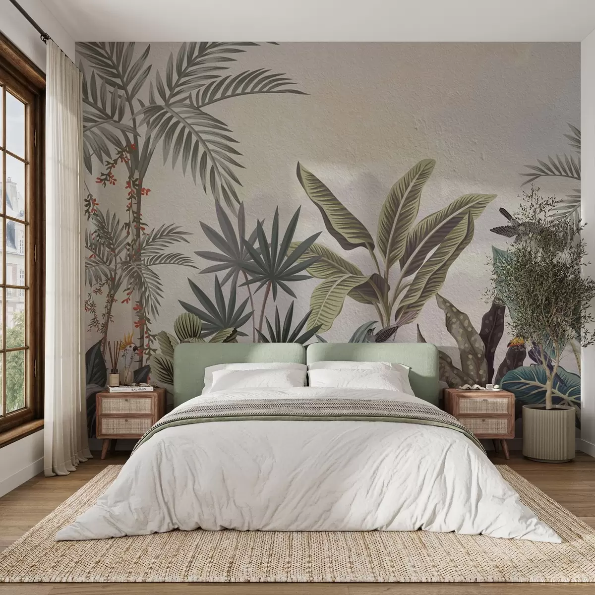 Тапете за зид Тропска џунгла са палмама и шареним птицама бр. w08496