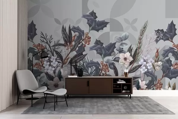 Тапете за зид Цветни аранжман са великим тамним листовима, цвећем и бобицама на пригушеној сивој геометријској апстрактној позадини бр. w08525