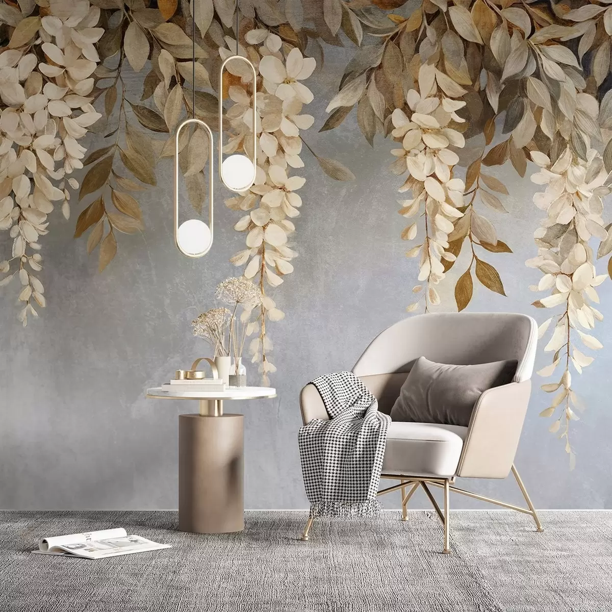 Тапете за зид Деликатно бело и светло беж цвеће глициније са лишћем каскадно на меко сивој позадини бр. w08531