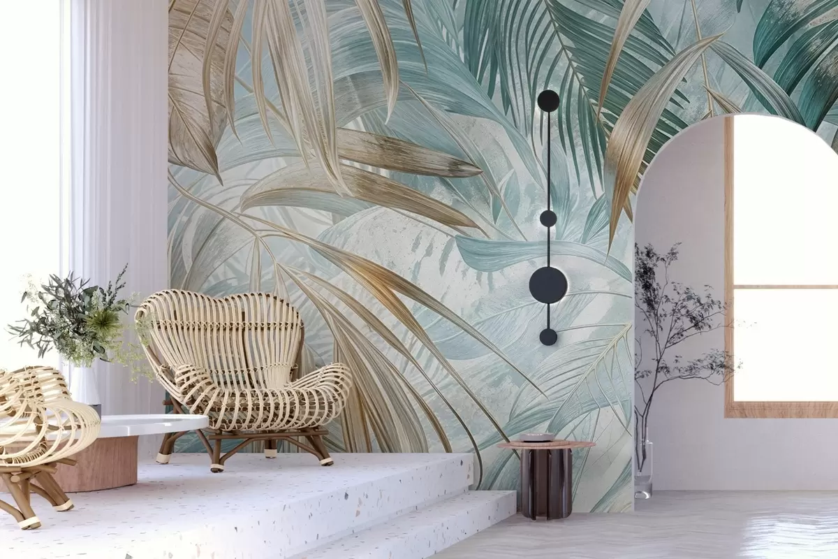 Тапете за зид Тропски апстрактни цветни принт са великим палминим листовима у нијансама плаве и беж ствара бујну атмосферу бр. w08532