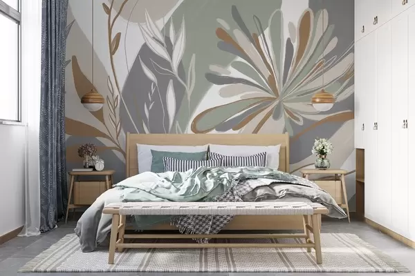 Тапете за зид Апстрактни цветни минималистички принт са стилизованим листовима и латицама у нијансама зелене, сиве и беж бр. w08536