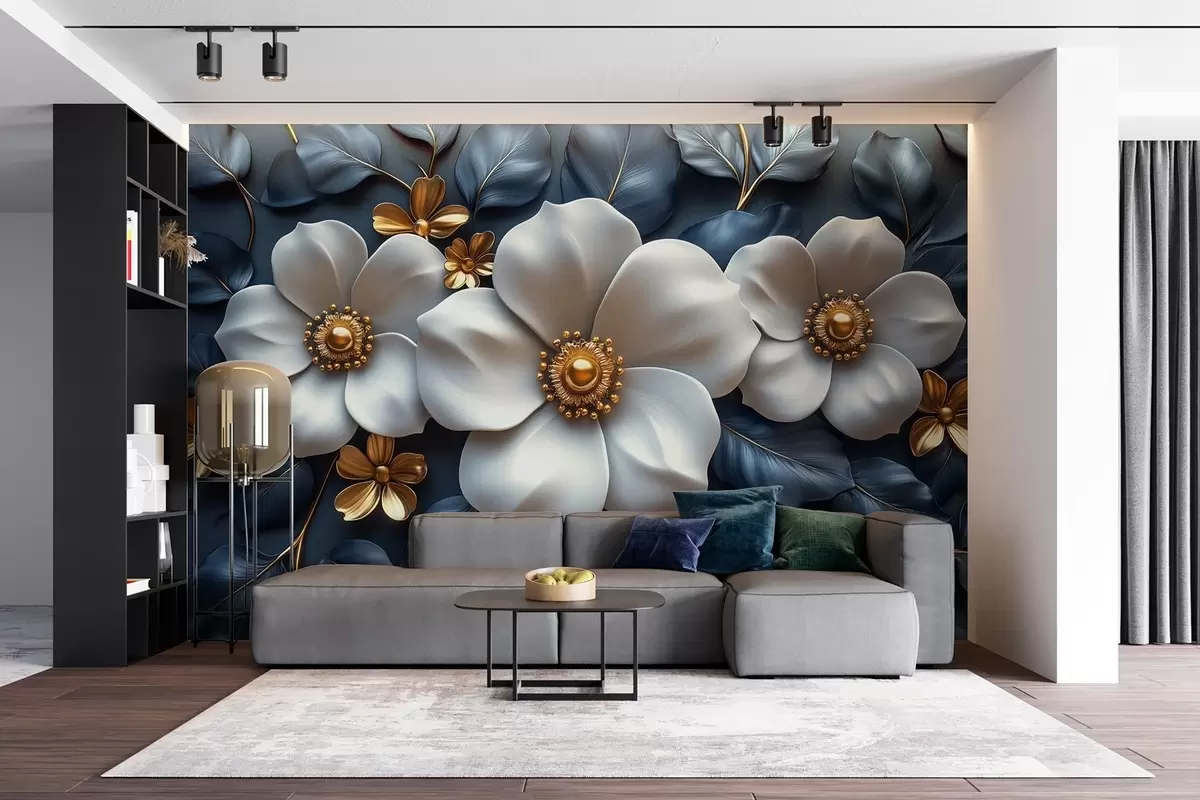 Тапете за зид Велики бели цветови на елегантној плавој позадини са листовима бр. w08559