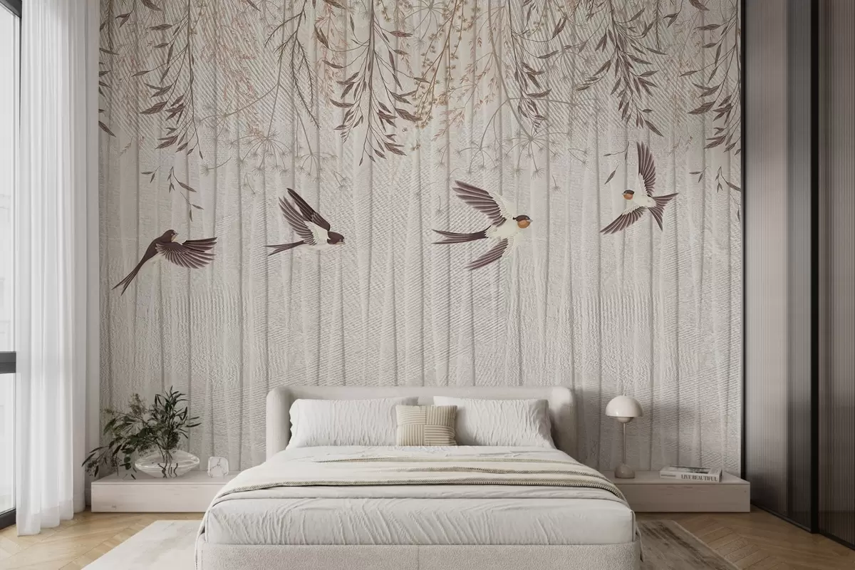 Тапете за зид Птице које лете на текстурираној позадини са маслачцима и цвећем бр. w08566