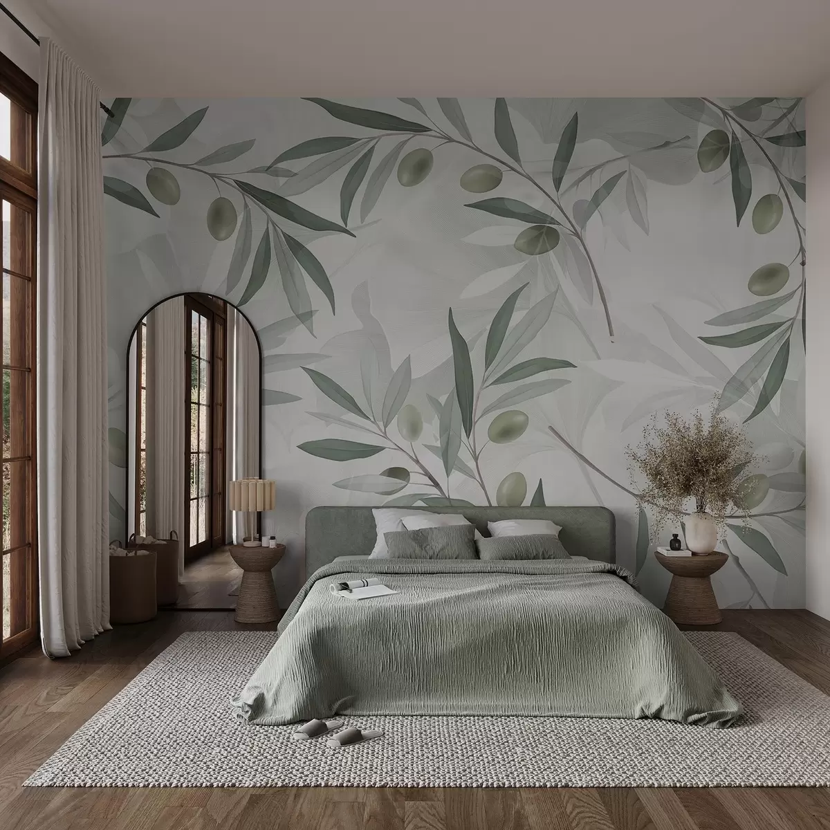 Тапете за зид Маслинове гранчице са зеленим листовима и маслинама на светлој позадини бр. w08576