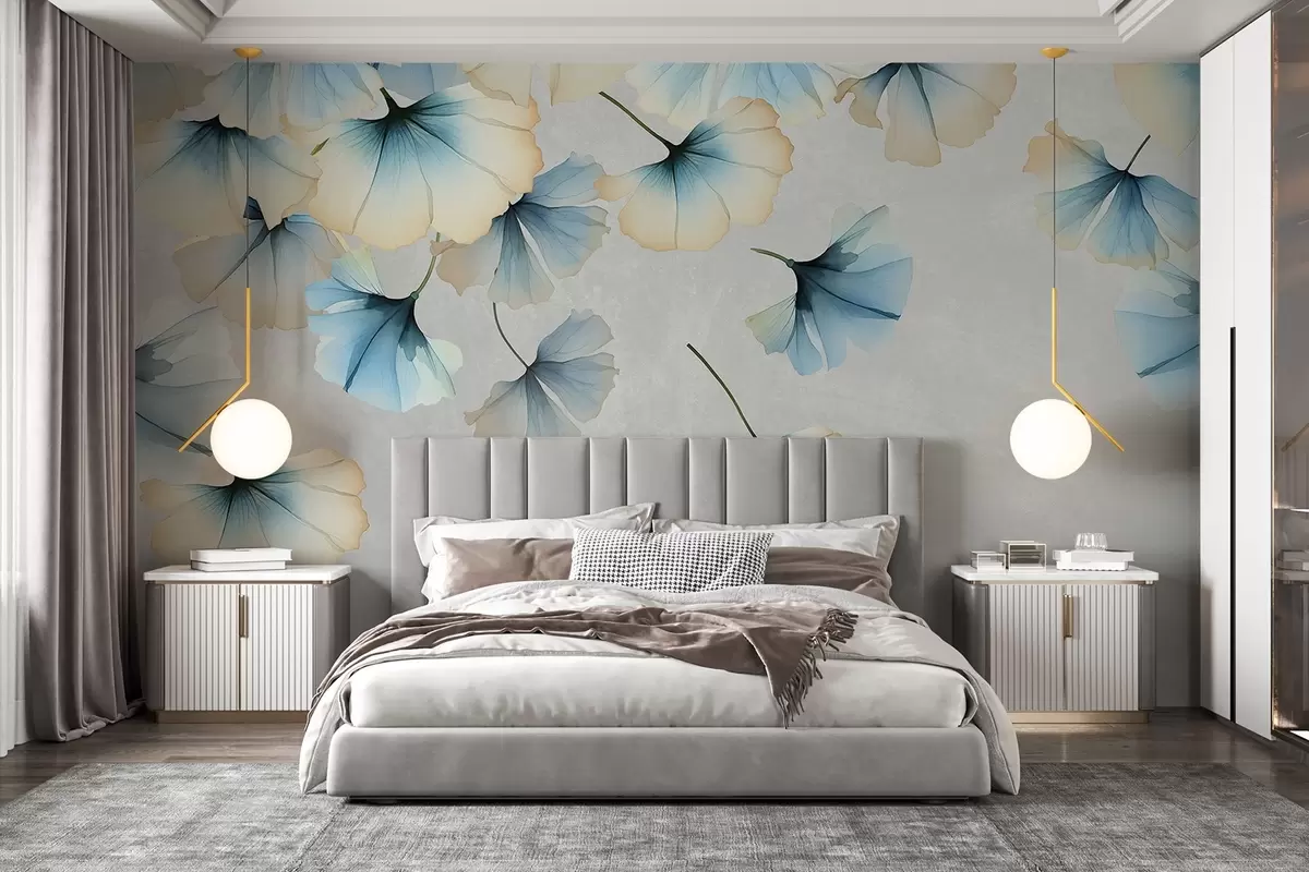 Тапете за зид Пастелно плаво и жуто лишће гинка са деликатним латицама које лебде у ваздуху на текстурној позадини бр. w08578v1
