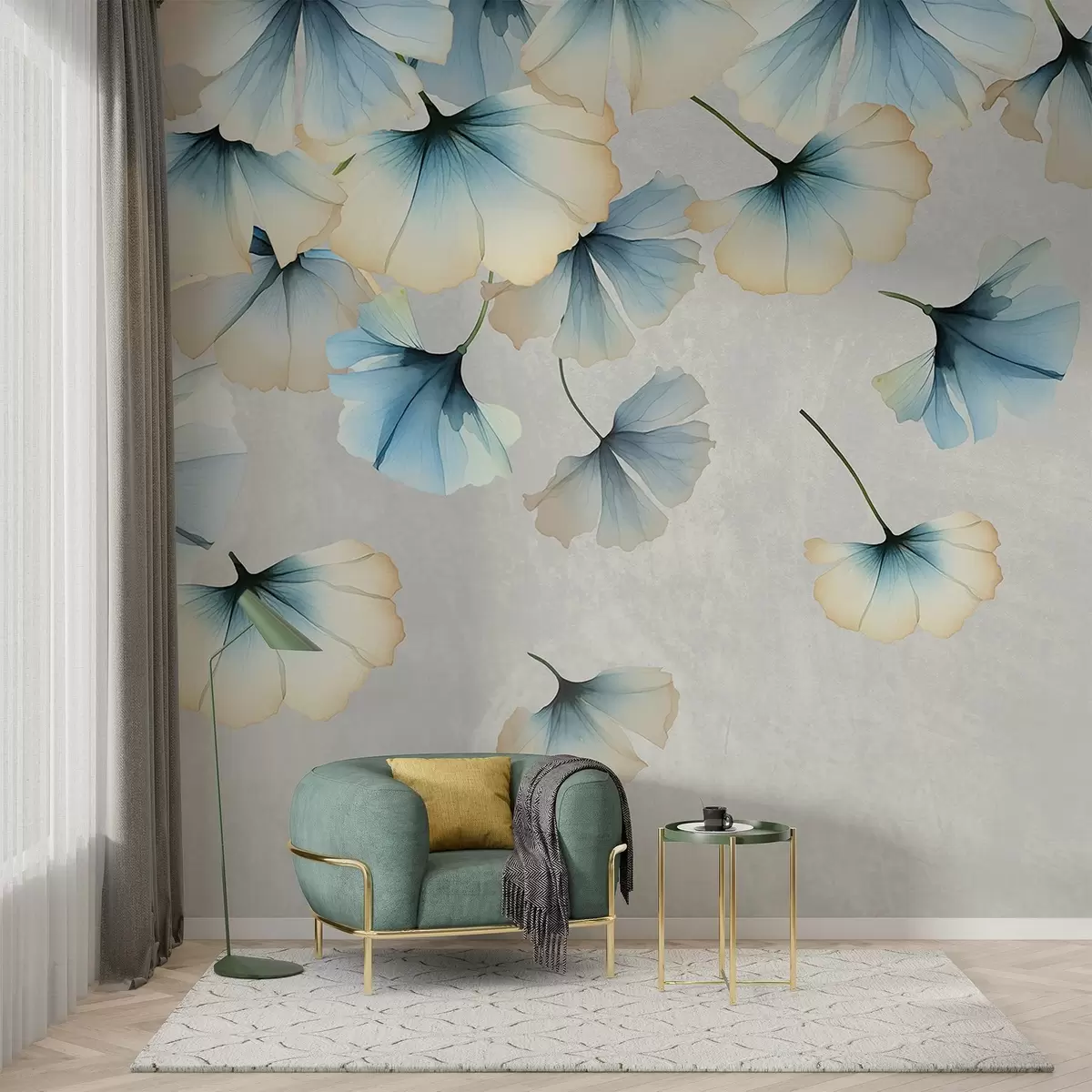 Тапете за зид Пастелно плаво и жуто лишће гинка са деликатним латицама које лебде у ваздуху на текстурној позадини бр. w08578v1
