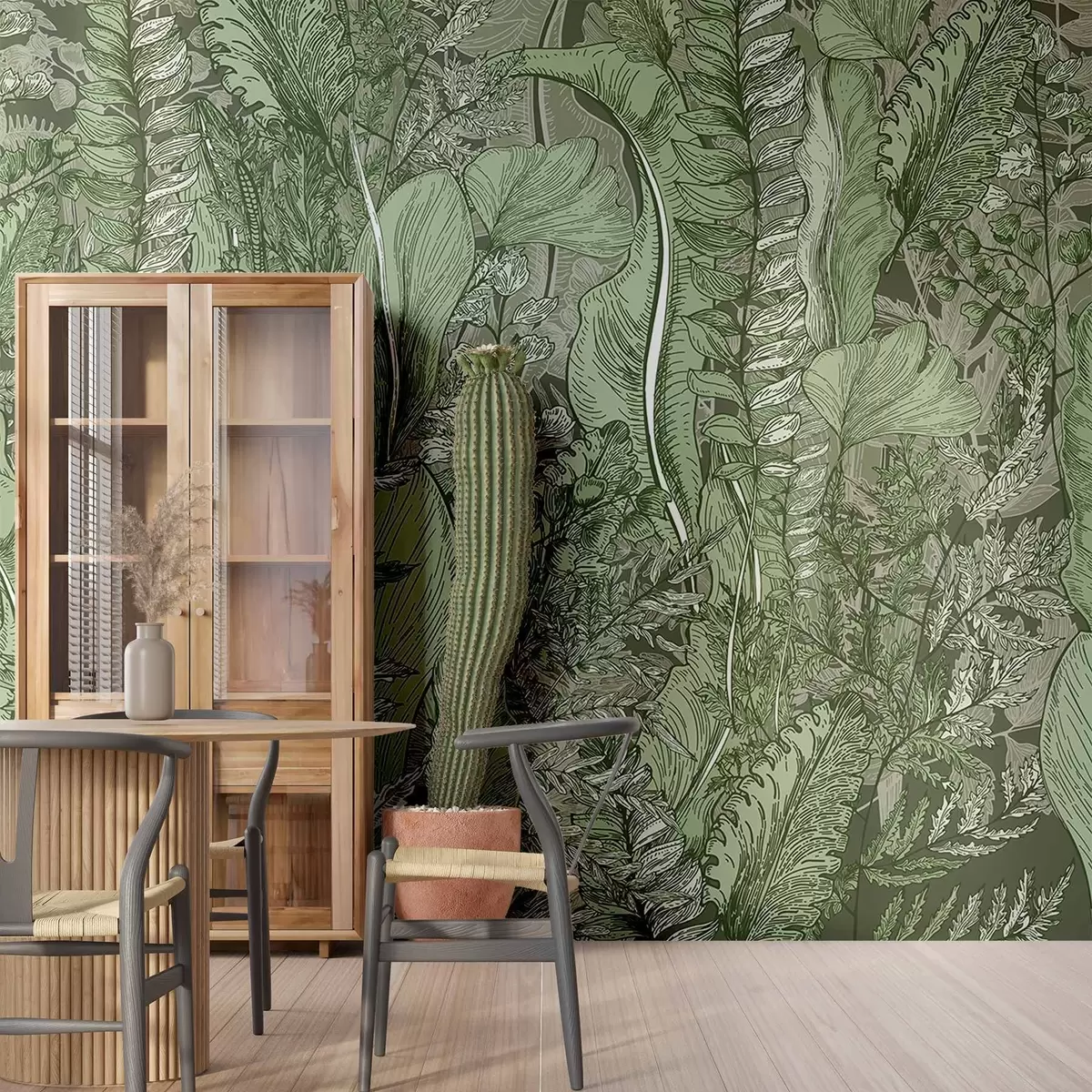 Тапете за зид Бујна, зелена шума са разним врстама папрати, лишћа и лишћа у нијансама зелене бр. w08579