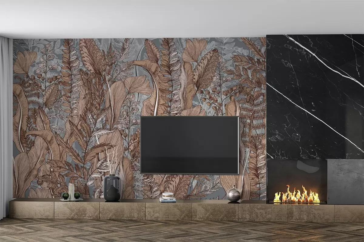 Тапете за зид Бујна, зелена шума са разним врстама папрати, лишћа и лишћа у нијансама браон, плаве и сиве бр. w08579v1