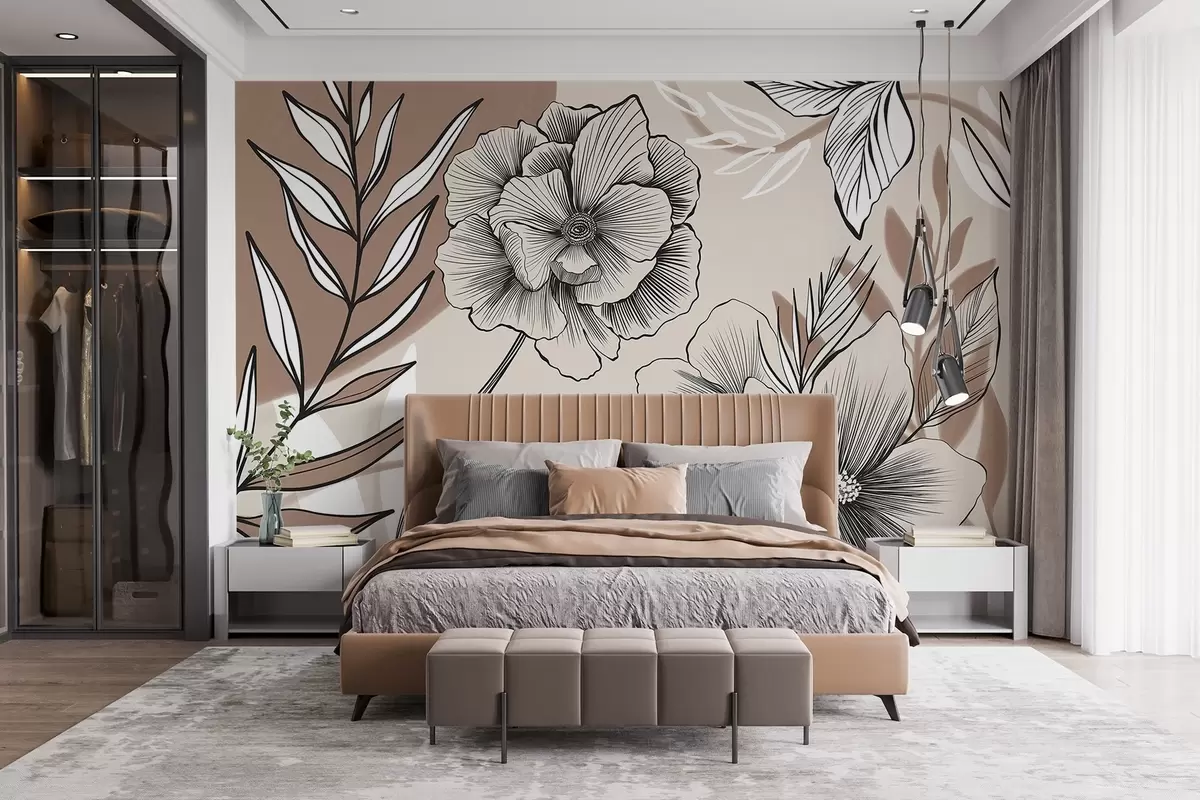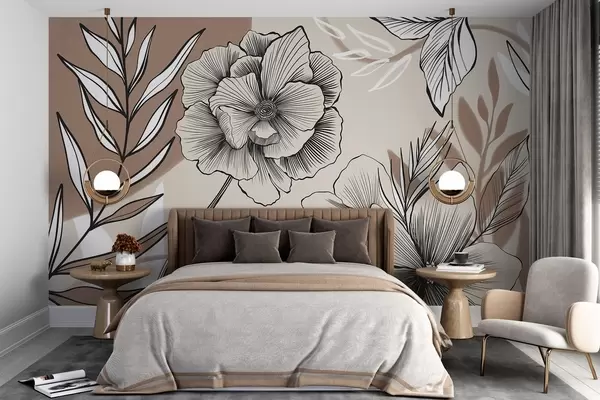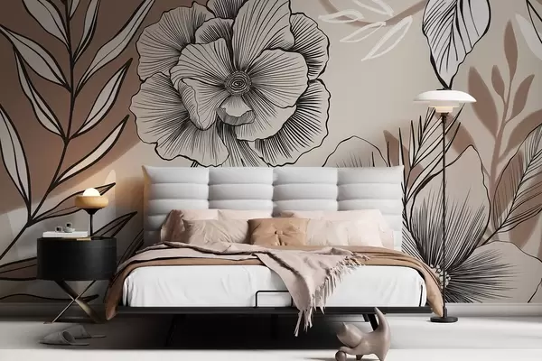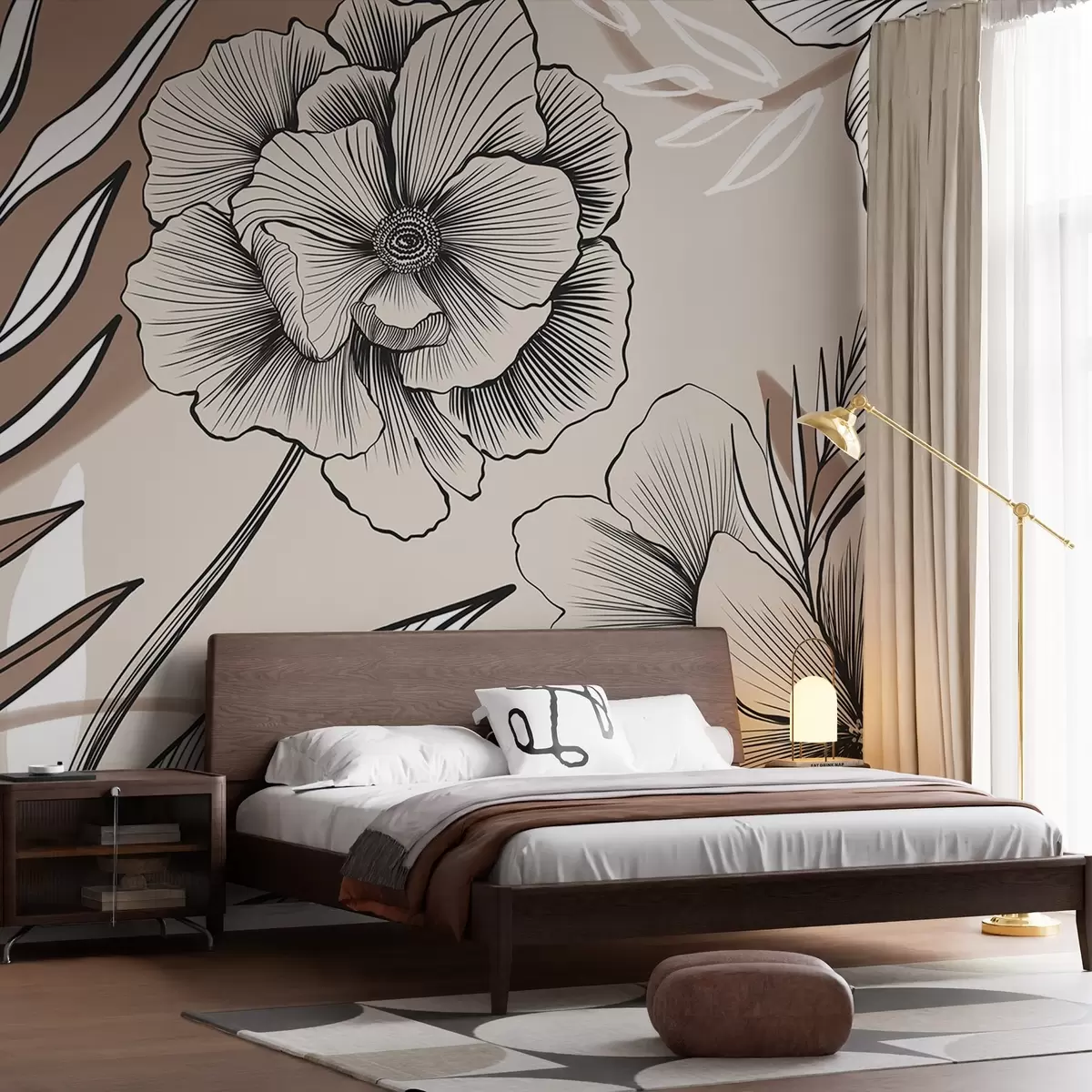 Тапете за зид Велико црно-бело графичко цвеће са детаљним листовима на беж апстрактној позадини бр. w08580
