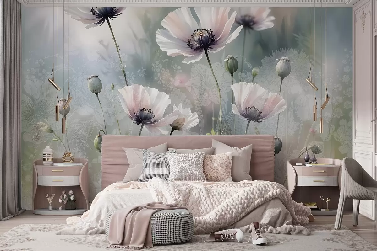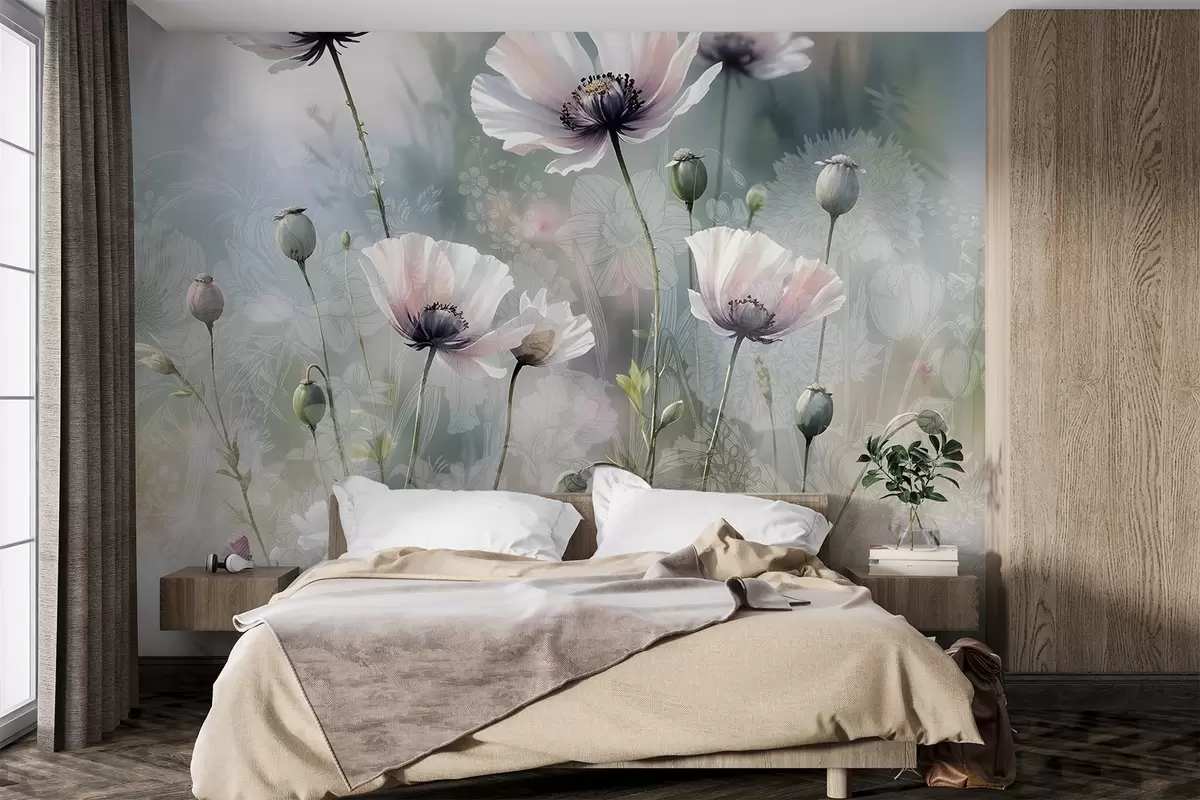 Тапете за зид Нежни ружичасти и љубичасти мак са зеленим стабљикама и пупољцима на мекој, замућеној текстурираној позадини бр. w08585