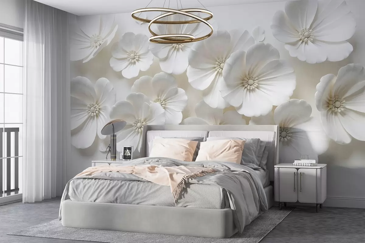 Тапете за зид Бели цветови са деликатним латицама и центрима на светлој позадини бр. w08587