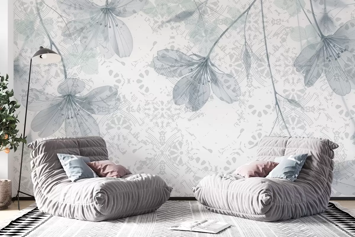 Тапете за зид Деликатно плаво и бело цвеће са дугим стабљикама и латицама на мекој, замућеној текстурној позадини бр. w08588