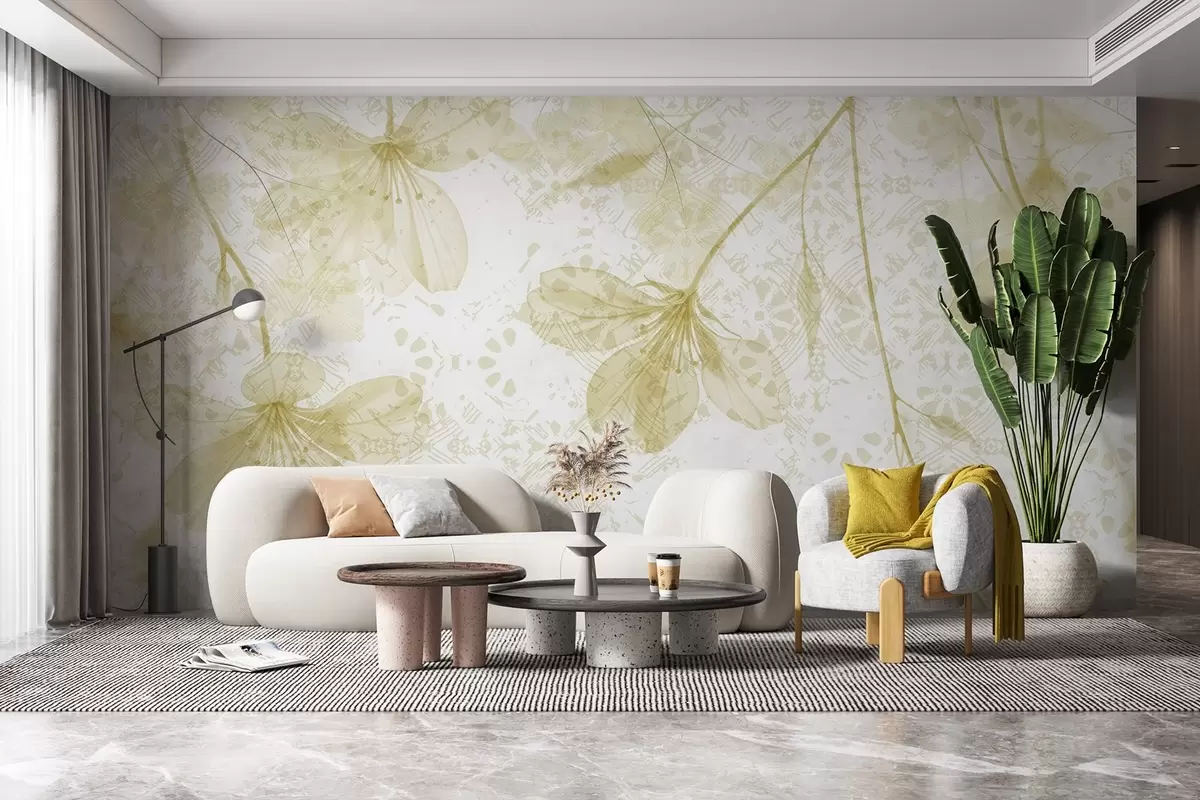 Тапете за зид Нежно жуто и бело цвеће са дугим стабљикама и латицама на мекој, замућеној текстурној позадини бр. w08588v2
