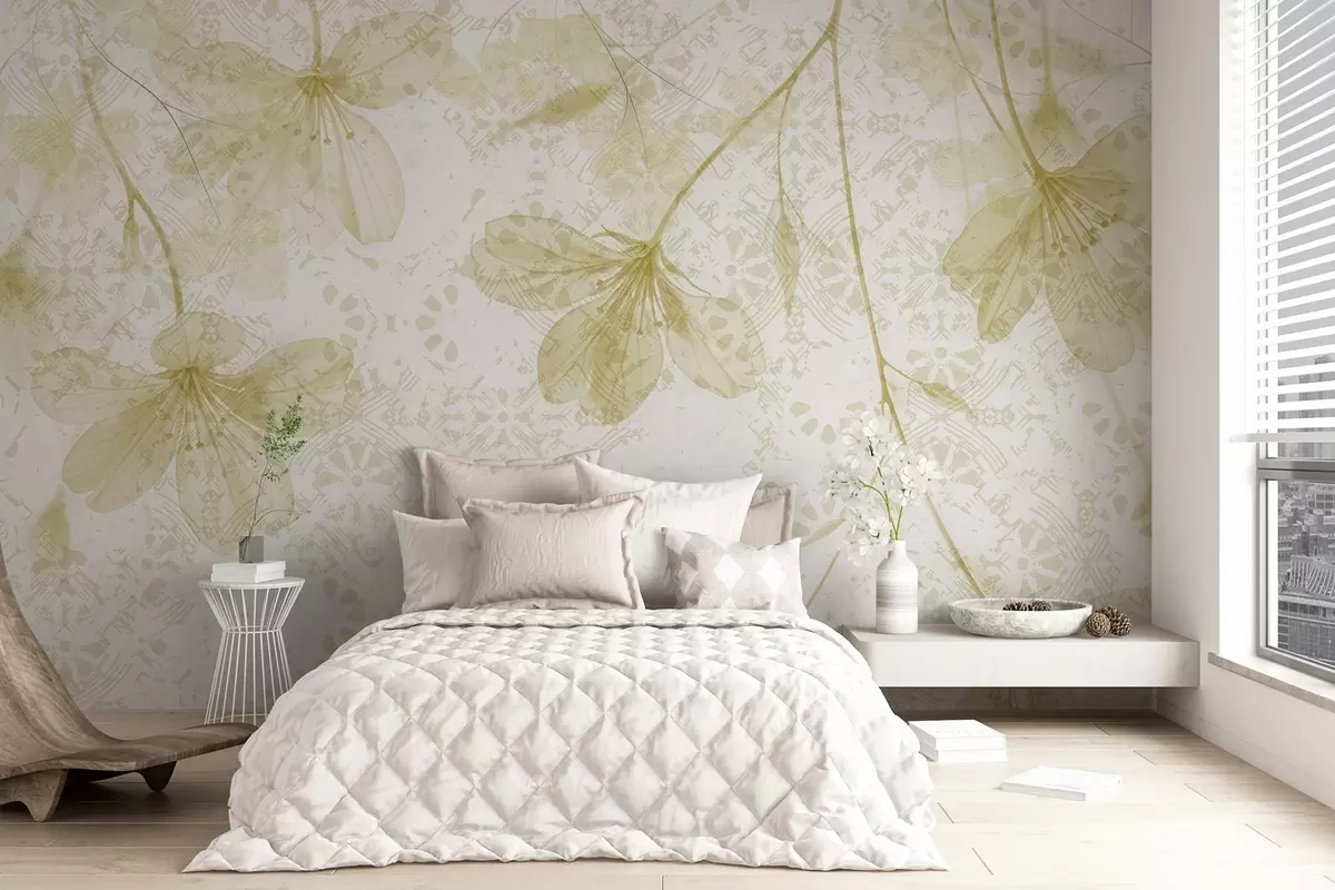 wall murals Нежно жуто и бело цвеће са дугим стабљикама и латицама на мекој, замућеној текстурној позадини w08588v2
