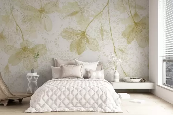 Тапете за зид Нежно жуто и бело цвеће са дугим стабљикама и латицама на мекој, замућеној текстурној позадини бр. w08588v2