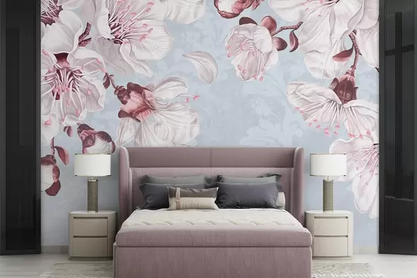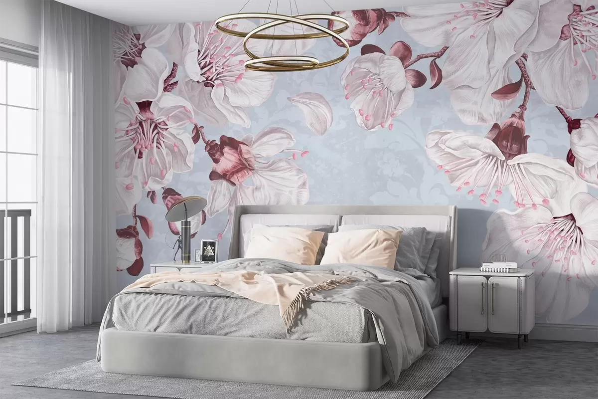 Тапете за зид Цветни принт са великим ружичастим и белим цветовима трешње на светло плавој текстурној позадини бр. w08601