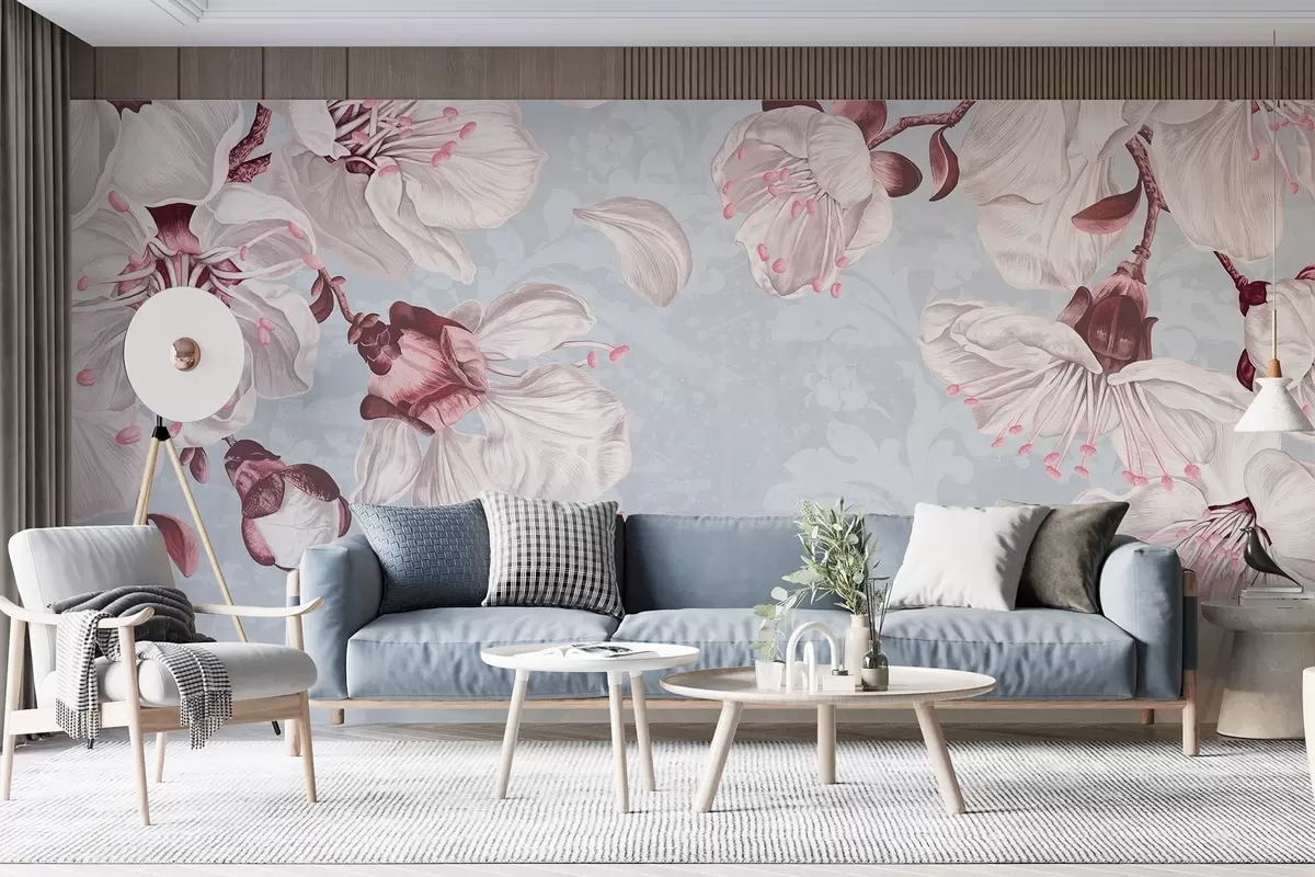 Тапете за зид Цветни принт са великим ружичастим и белим цветовима трешње на светло плавој текстурној позадини бр. w08601