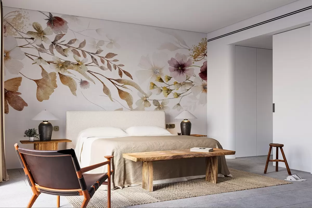 Тапете за зид Цветни аранжман меких, пригушених боја са беж и белим цветовима и листовима на светлој позадини бр. w08603