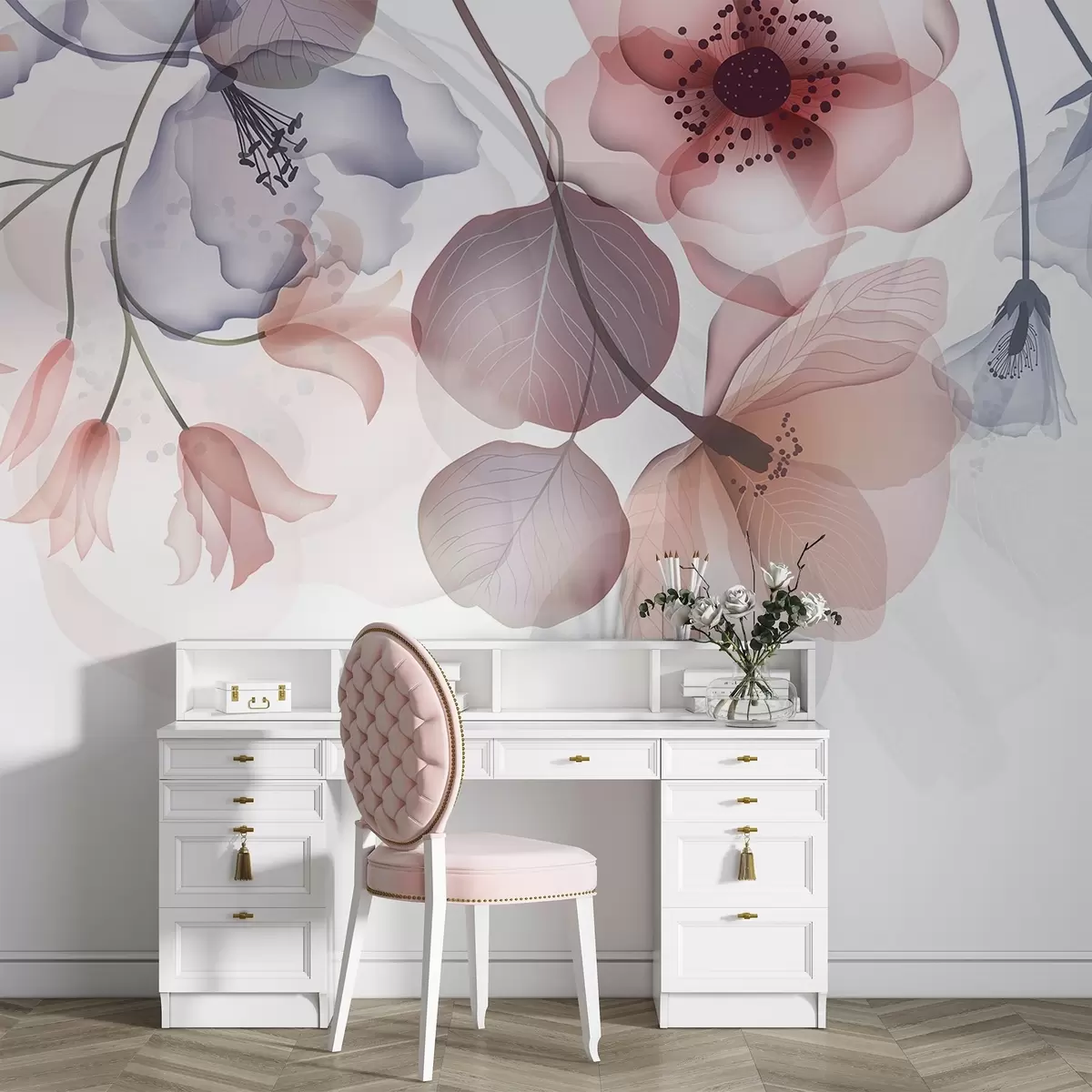 Тапете за зид Нежно розе и сиво прозирно цвеће са меким латицама и тамним средиштима, на светлој позадини бр. w08613