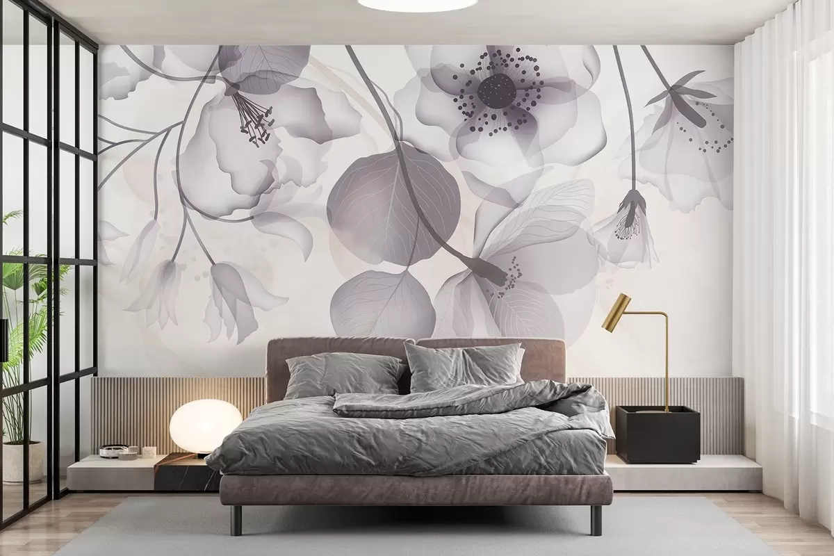 Тапете за зид Деликатно сиво и беж прозирно цвеће са меким латицама и тамним срединама, на светлој позадини бр. w08613v2